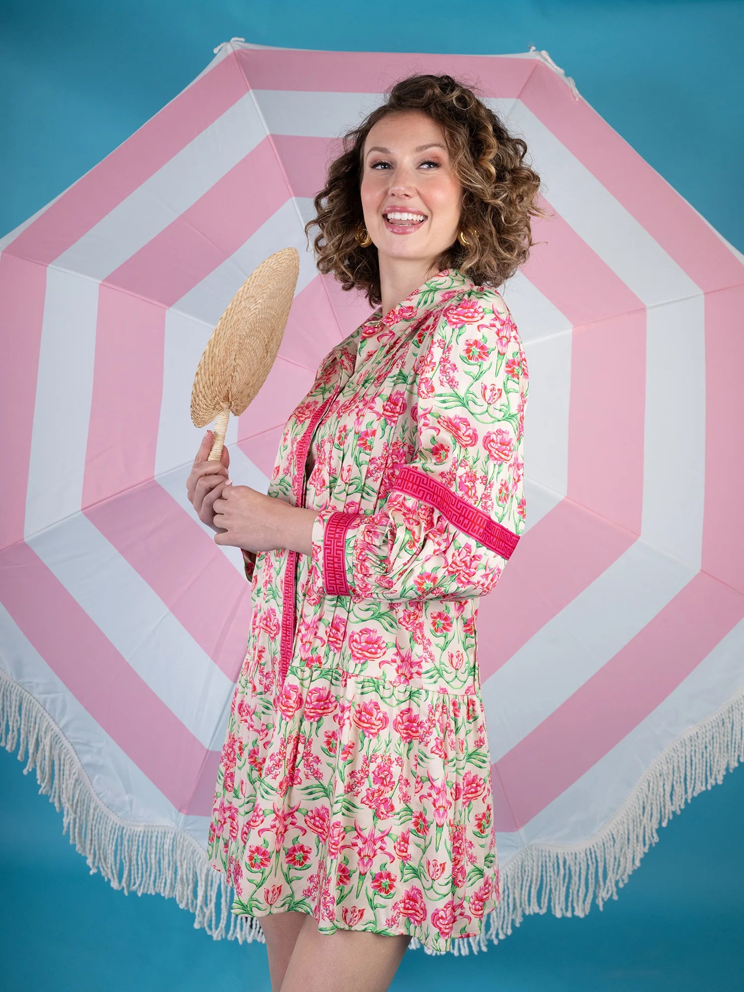 Unleash your wild side in the Delany Dress Garden Cheetah, a captivating blend of playful whimsy and refined detail. The Garden Cheetah print appears as a delicate floral pattern at first glance, but converges to form the face of a cheetah, creating a fun visual puzzle. Featuring a classic fold collar and a drop waist hem, creating a silhouette that is both flattering and timeless. Pin tuck details add a touch of texture and depth, elevating the design. Our signature monogram trimming, strategically placed along the sleeves and over the front buttons, sets this dress apart as a statement piece!