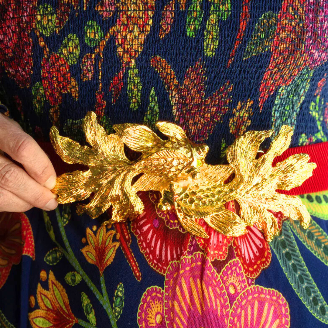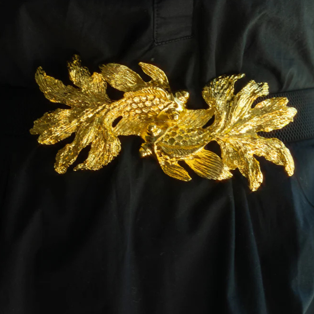 The intricate Koi Belt Buckle showcases beautifully intertwined koi fish, symbolizing elegance and artistry. Expertly crafted from durable zinc alloy with a radiant metallic gold-tone finish, this bold statement piece is designed to captivate. We often say that this belt buckle IS the dress!