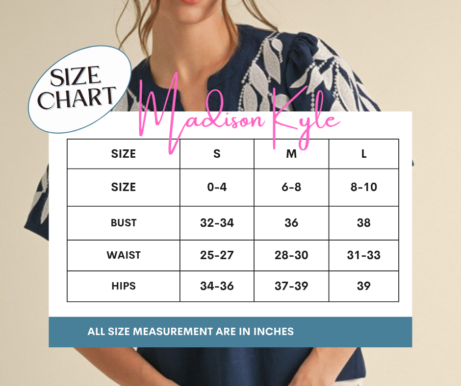 Solid top with split neck, puff sleeve and leaf embroidered detail.
