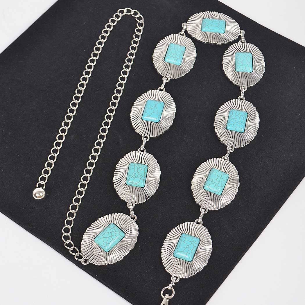 * Western Style Metal Chain Belt * IRON * APPROX. WIDTH:2".LENGTH:48" * Discover the "Western Style Metal Chain Belt" a captivating Western-style metal chain belt adorned with exquisite turquoise stones. This piece is perfect for those who want to make a bold statement while embracing the spirit of the West.